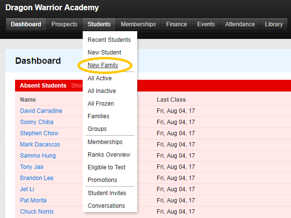 - Hover over the Students menu and click on New Family.