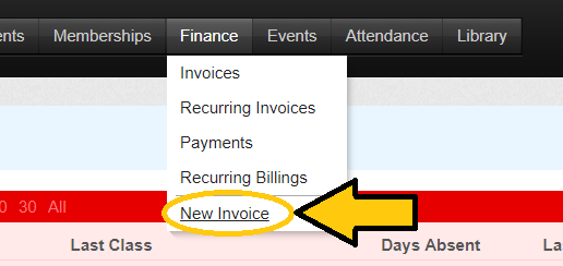 Kicksite provides you with the ability to create invoices so that you can easily track payments within your system. To create an invoice, hover over the Finance menu and click on New Invoice.