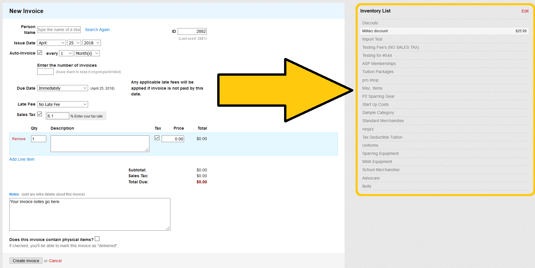 Sales tax is defaulted to the parameters set in the Invoice Details (in the Settings menu). The sales tax can be toggled on and off as needed to allow you to invoice for anything from tuition to testing fees to pro shop items. You can also adjust the sales tax on the fly.