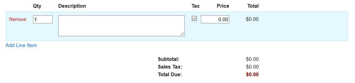 The next step is to add line items to the invoice. Each line item can add a quantity, a description, and a price. Multiple line items can added and each line item can have tax added or removed as needed.