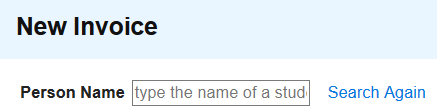The first step to creating a new invoice is attaching a student or prospect to it. Begin by typing the name of the client in the box for Person Name. As you type the client's name, a list of students' names will appear below this box that share the letters that you are typing. When you click a name from this list, it will link this invoice to the client. If the client on the invoice needs to be changed, click on the Search Again link.