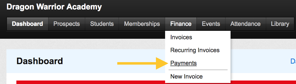 - Hover over the Finance menu and then click Payments.