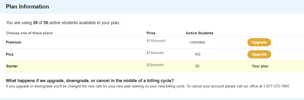 - Once you have added enough students into Kicksite to reach the next level, the system will prompt you to upgrade your plan