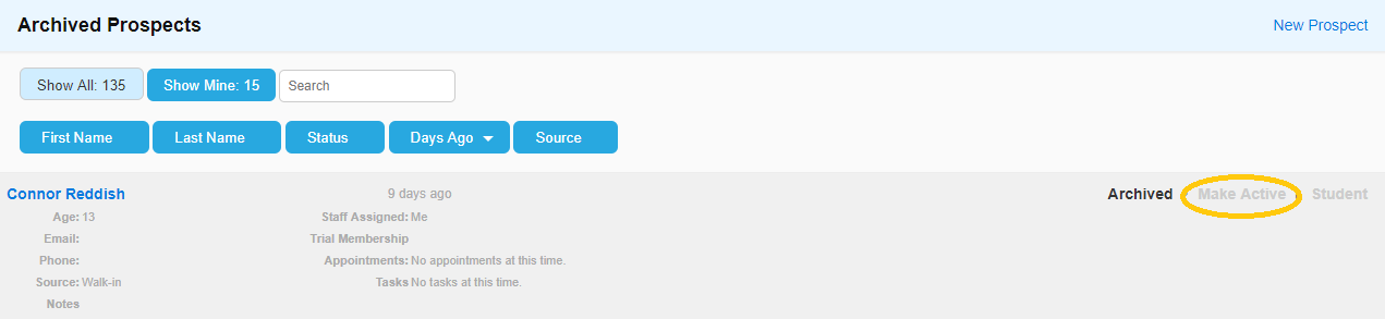 3.The prospect will then disappear off of the Archived Prospect list and appear on the Active Prospect list.