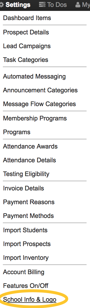 - Hover over Settings in the top right menu and then click on the last option that says School Info and Logo
