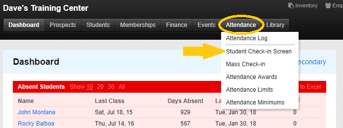 - Hover over the Attendance tab and click on Student Check-in Screen